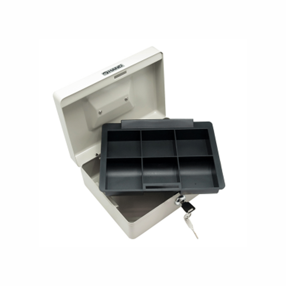 Caja metálica color blanco perlado y esquinas redondeadas. Bandeja