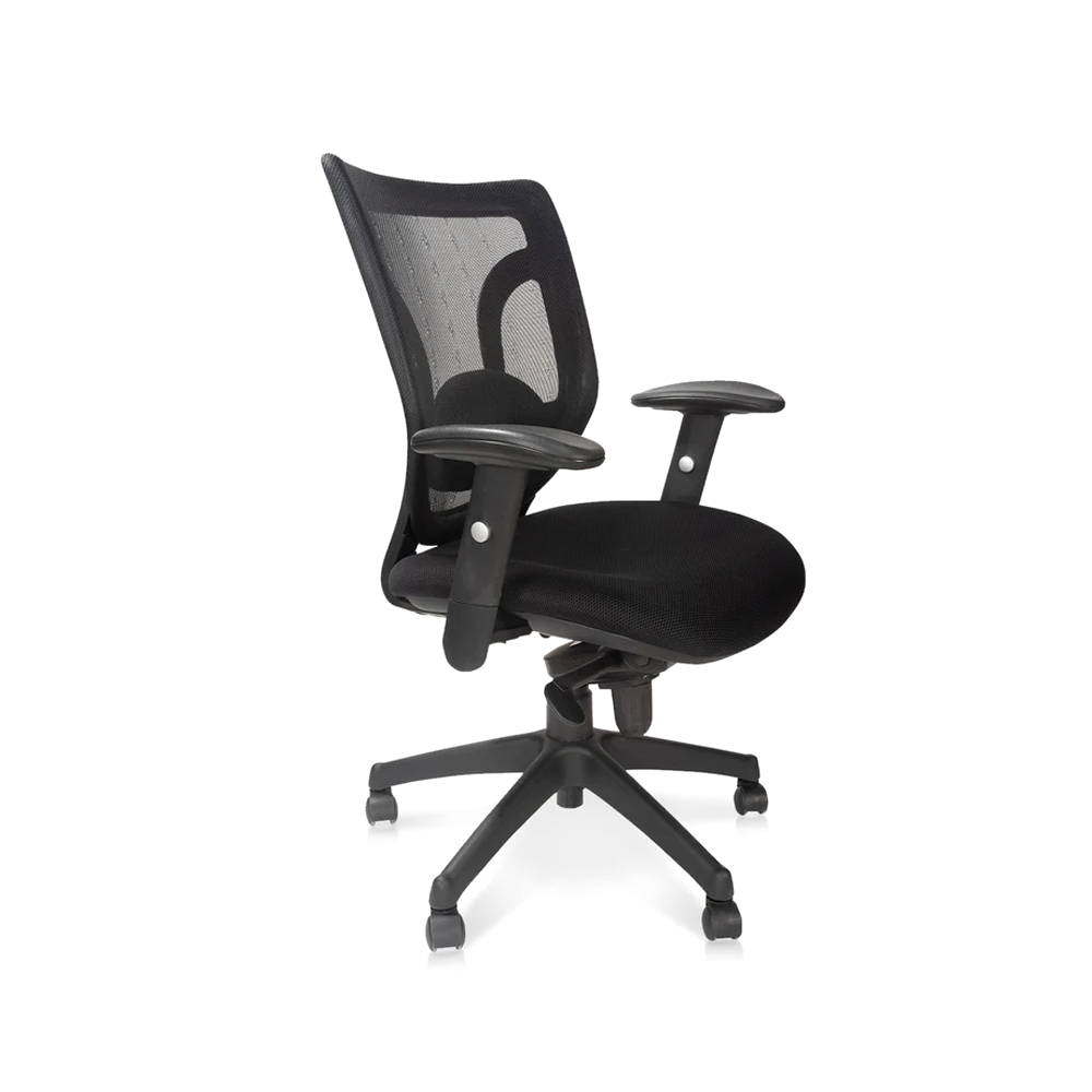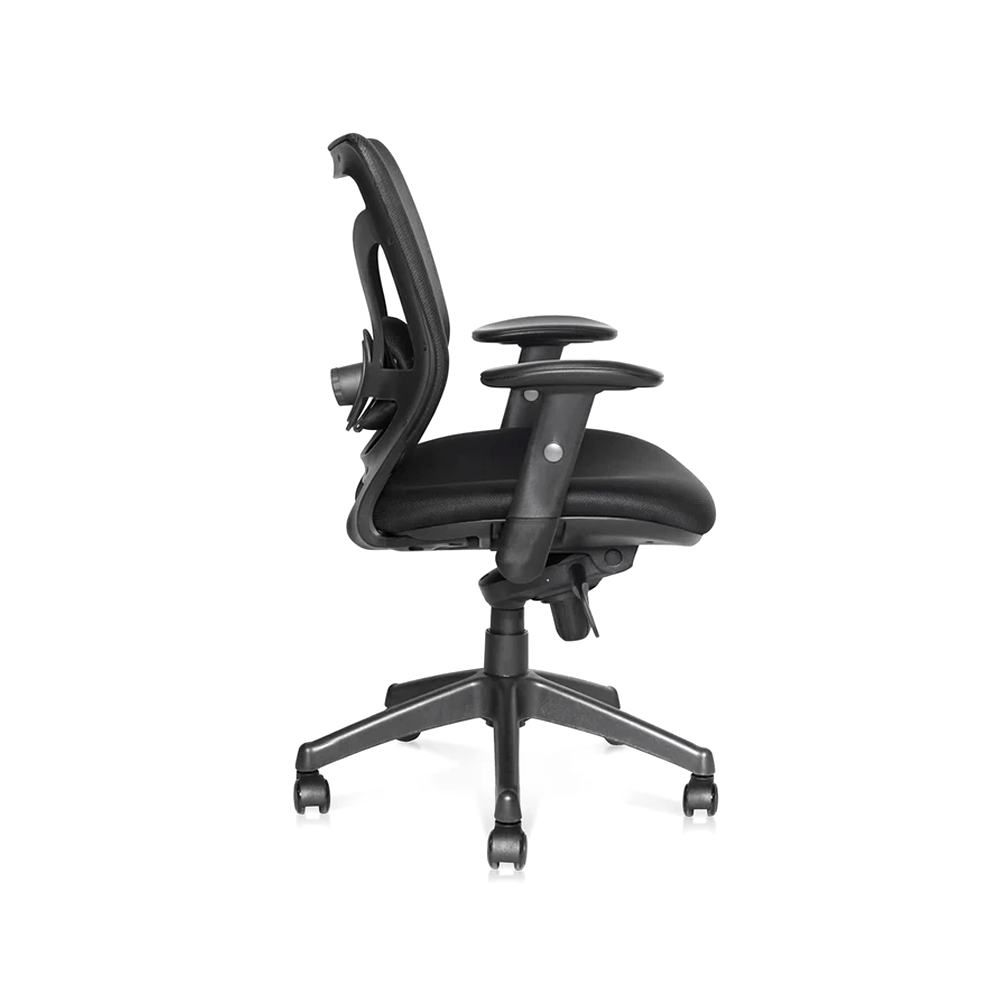 La silla Black esta disponible con respaldo en malla con soporte lumbar regulable acolchado y asiento tapizado en tela negra. Regulación de altura del asiento mediante cilindro de gas neumático. Base en poliamida reforzada en fibra de vidrio, con ruedas de 50 mm. de recorrido. Brazos regulables en altura. Cabecero en malla opcional